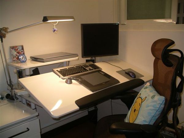 不管看書打字塗鴉,桌面傾斜起來一直是我的夢想,而且整體質感和設計真的很棒,從優美檯燈、螢幕架到主機架都滿意,電腦椅通身可調整(機關看到眼花)、透氣又舒適,結果就把套餐買下來了orz 果然一分錢一分貨啊...